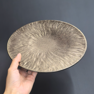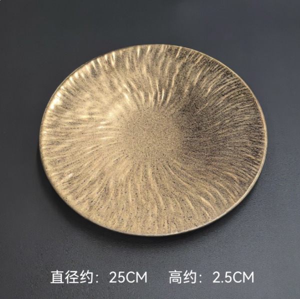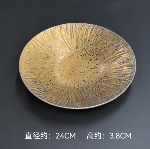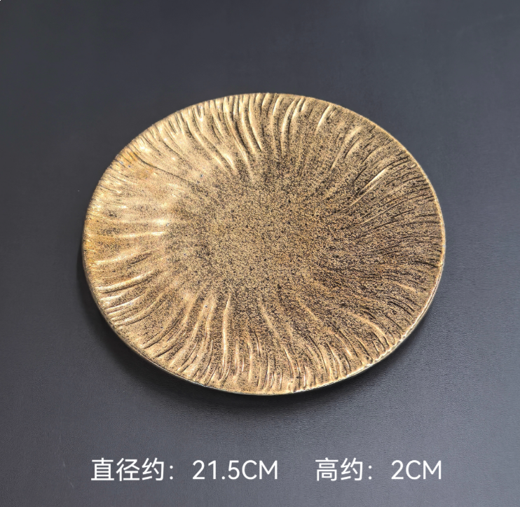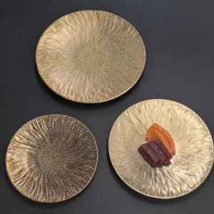Đĩa gốm Nhật tròn họa tiết vàng ánh kim là một lựa chọn cao cấp dành cho nhà hàng Nhật, quán sushi – sashimi, hoặc những ai yêu thích phong cách ẩm thực tinh tế. Sự kết hợp giữa màu vàng ánh kim sang trọng và bề mặt gốm sần độc đáo giúp tôn lên vẻ đẹp tự nhiên của từng lát cá, từng món ăn nghệ thuật.