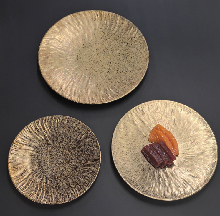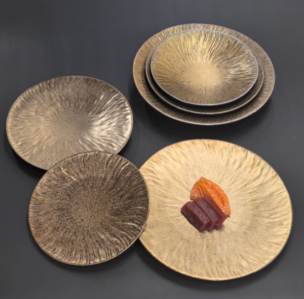 Thiết kế sang trọng: Mặt đĩa tròn rộng, viền bo nhẹ, họa tiết ánh vàng phủ đều như vầng sáng, tạo điểm nhấn nổi bật khi bày sashimi hoặc món Nhật.
