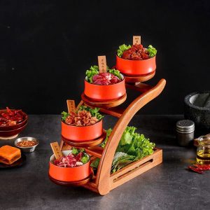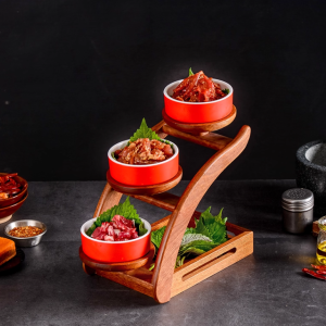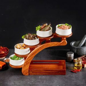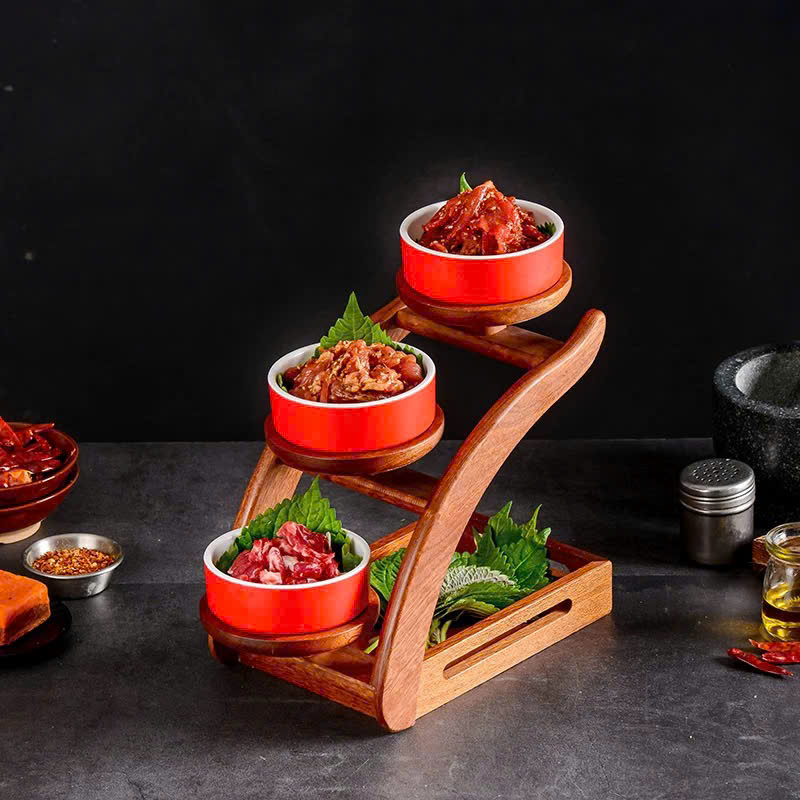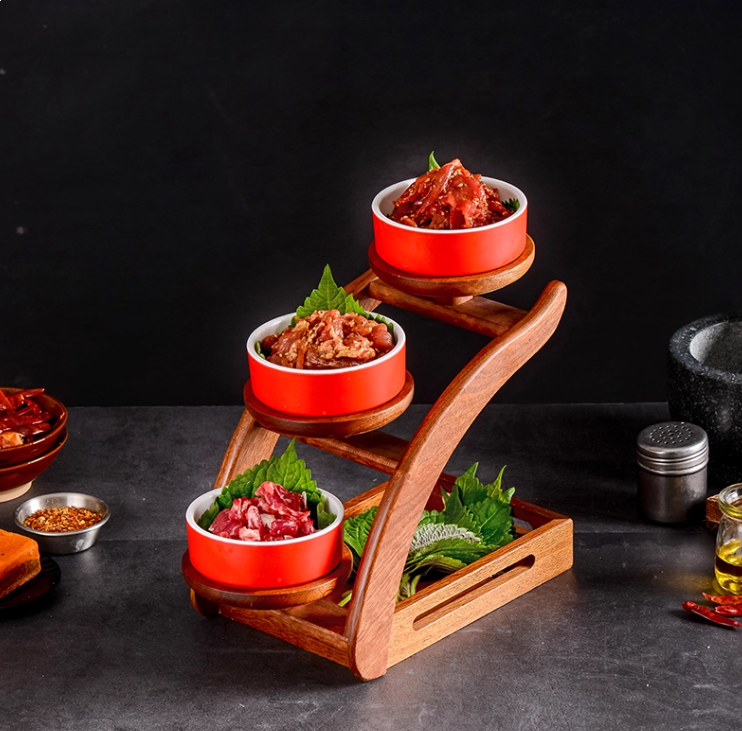 Nâng tầm cách trình bày món ăn với kệ gỗ trưng bày tầng phong cách Nhật Bản – thiết kế độc đáo dạng bậc cầu thang, giúp bàn ăn trở nên sang trọng và chuyên nghiệp như trong nhà hàng.